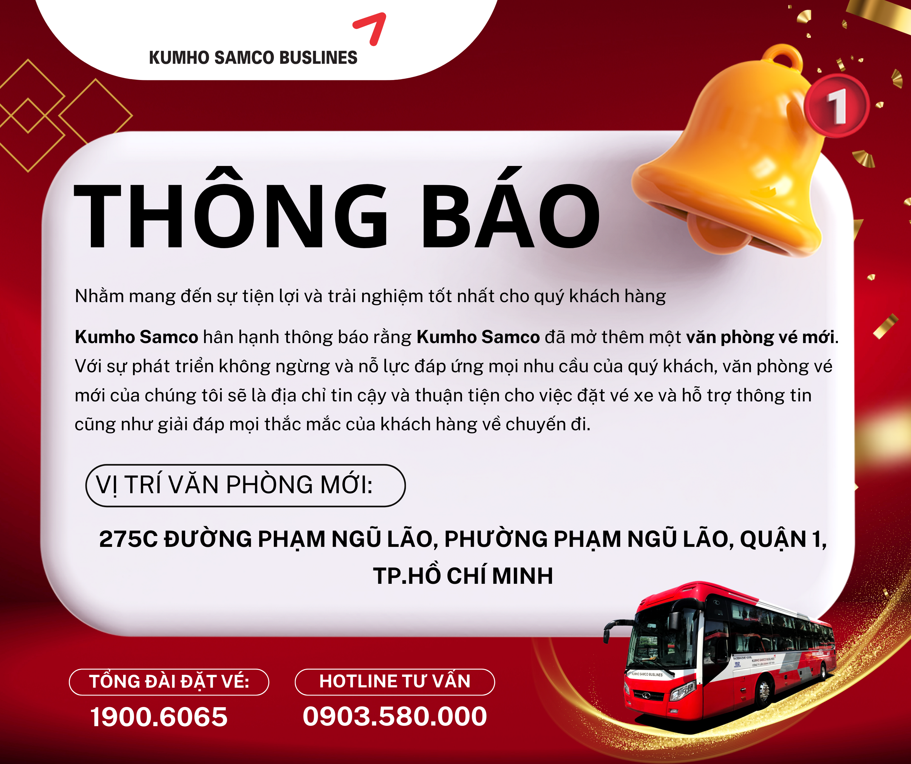 Kumho Samco xin hân hạnh thông báo đến khách hàng về thông tin Kumho Samco đã mở thêm một văn phòng vé mới với mục đích mang đến sự tiện lợi và trải nghiệm tốt nhất cho quý khách hàng. Với sự phát triển không ngừng và nỗ lực đáp ứng mọi nhu cầu của quý khách, văn phòng vé mới của Kumho Samco vẫn sẽ là địa chỉ tin cậy và thuận tiện cho việc đặt vé và hỗ trợ thông tin cho khách hàng.